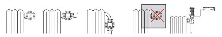 ГЕРЦ-термостатическая головка ни в коем случае не должна попадать под влияние прямых солничных лучей или устройств, сильно излучающих тепло (например телевизора). Так же радиаторные панели, покрыты тяжёлыми шторами или другим предметами, образуют зону тепла, из-за которой термостат не чувствует температуры в помещении и неправильно работает. В таких случаях нужно применять термоголовку с выносным датчиком или дистанционным регулированием.